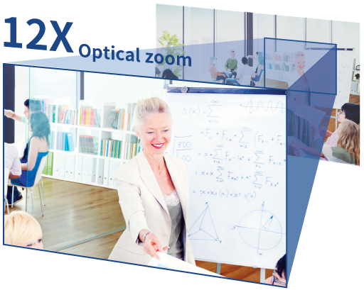 Được trang bị ống kính zoom quang học 12X, ngay cả khi máy ảnh được đặt trong không gian rộng, chẳng hạn như thính phòng, cuối lớp học kiểu bậc thang, bạn vẫn có thể có được một video chất lượng rõ ràng và tuyệt vời.