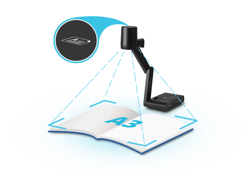 Khu vực bắt hình lớn hơn khổ A3 chụp các vật phẩm lớn như mô hình tòa nhà. Ngoài ra, vạch báo vị trí trên đầu camera giúp giáo viên luôn hiển thị chính xác tài liệu.